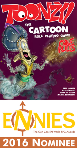 TOONZY! is the ENNIE nominated Cartoon Role-Playing Game where you and your friends assume the roles of cartoon characters in a hilarious setting. You can act out your favorite cartoon character or make up your own unique creation as you play through a variety of funny situations and zany adventures. You can become a funny character who does hilarious and outlandish things, engages in slapstick humor, encounters bizarre scenarios, and parodies real life. It helps to be weird, a bit neurotic, or just simply maladjusted to play.